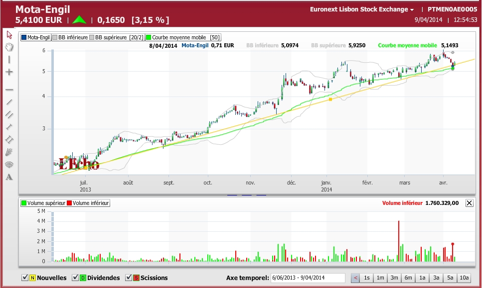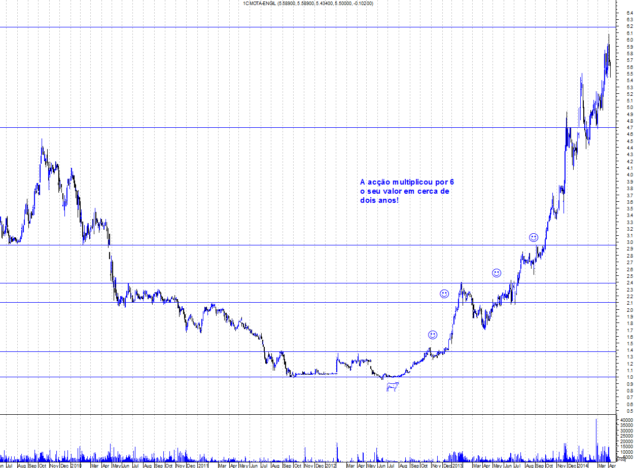 Agora para se tentar perceber qual das 2 a mais correcta é seguir a cotação nos próximos dias, na minha opinião, já disse que caso a Mota engil fechar abaixo dos 5.47 é mau sinal porque seria só um reteste à LTA e retomar o caminho descendente. Caso nos próximos dias continue a recuperação do preço inclusivamente ultrapassar os 5.50, então realmente o movimento correctivo pode ter ficado por aqui, tendo reagido ao teu desenho.