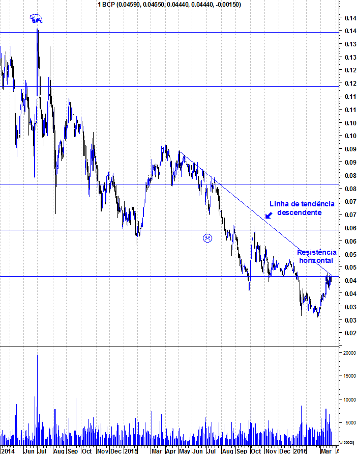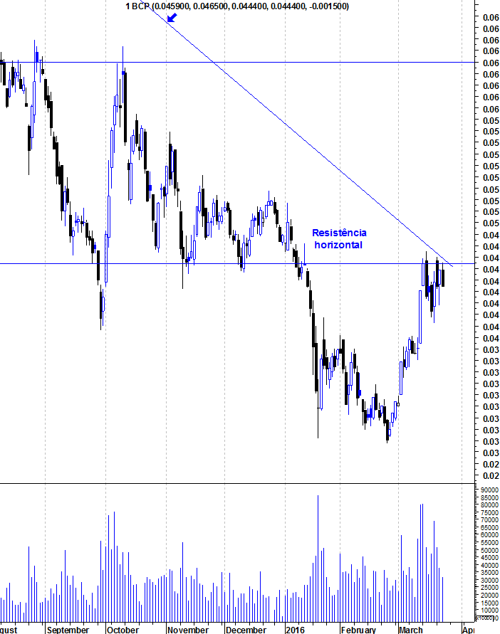 A situação técnica do BCP mantém-se inalterada. Continua a tentar ultrapassar a resistência horizonta e Linha de tendência descendente. Enquanto não o fizer, os ursos têm o benefício da dúvida.