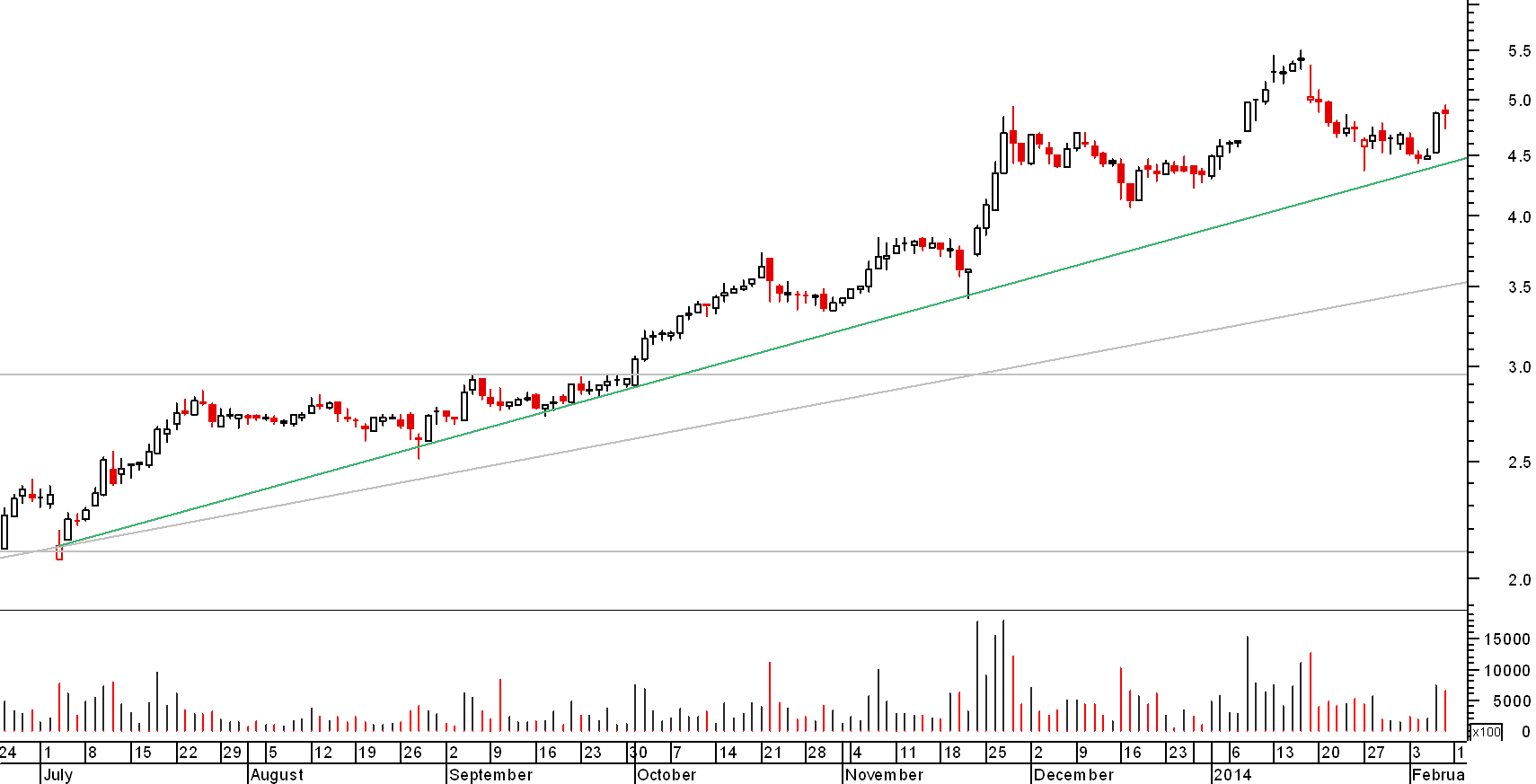 Os 4,7€ surgem citados porque foram a resistência mais recente à subida da cotação do papel nos dias 27 de Novembro e nos dias 3 e 12 de Dezembro. Este valor foi superado no dia 8 de Janeiro e voltou a ser superado no passado dia 6 de Fevereiro de pois de ultrapassada a barafunda dos emergentes.