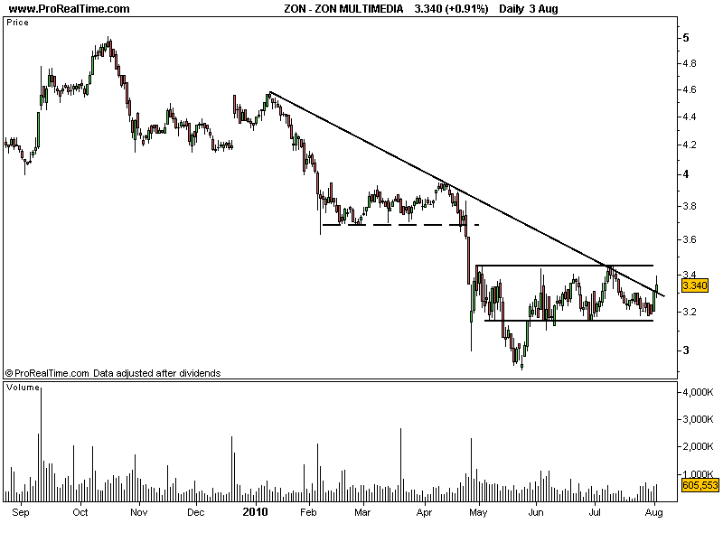 Tanto há 3 dias atrás como hoje, quando a Zon bate nos 3.17 desencadeia-se uma forte resistencia à sua descida, ou seja, poderá ser esse o limite superior da zona de suporte que forma o seu range.