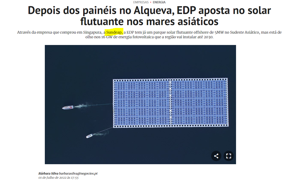 A EDP anunciou esta sexta-feira que quer ampliar a capacidade solar flutuante offshore que já detém no sudeste asiático, através da empresa Sunseap, que adquiriu recentemente em Singapura. Na mira estão os 16 gigawatts de energia fotovoltaica que a região deverá instalar em rios e mares até 2030, avança a Reuters.