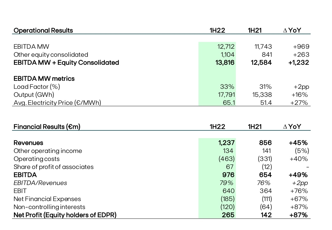 Acabam de ser publicados os resultados do 1º semestre (1H2022) da EDPR.
