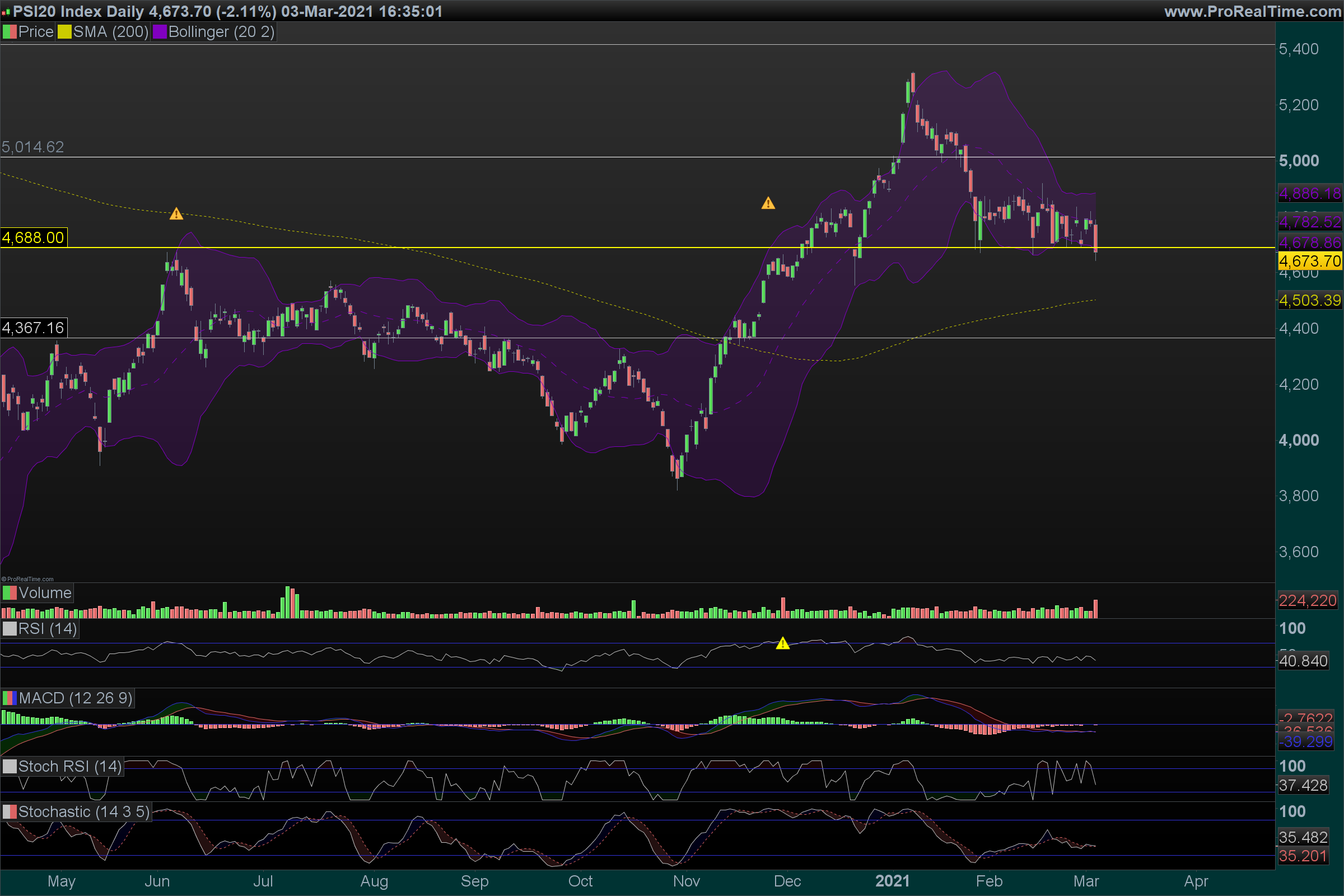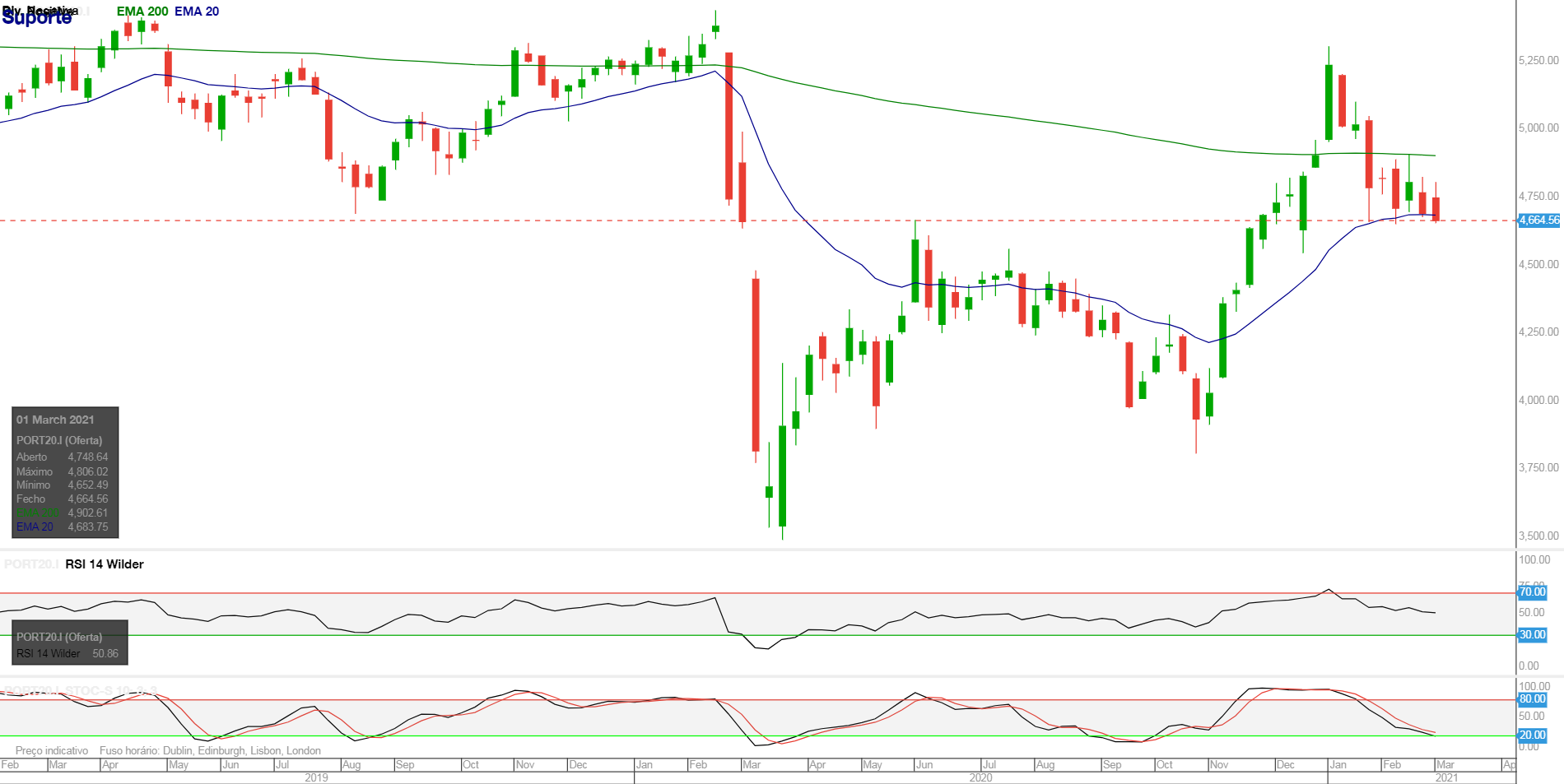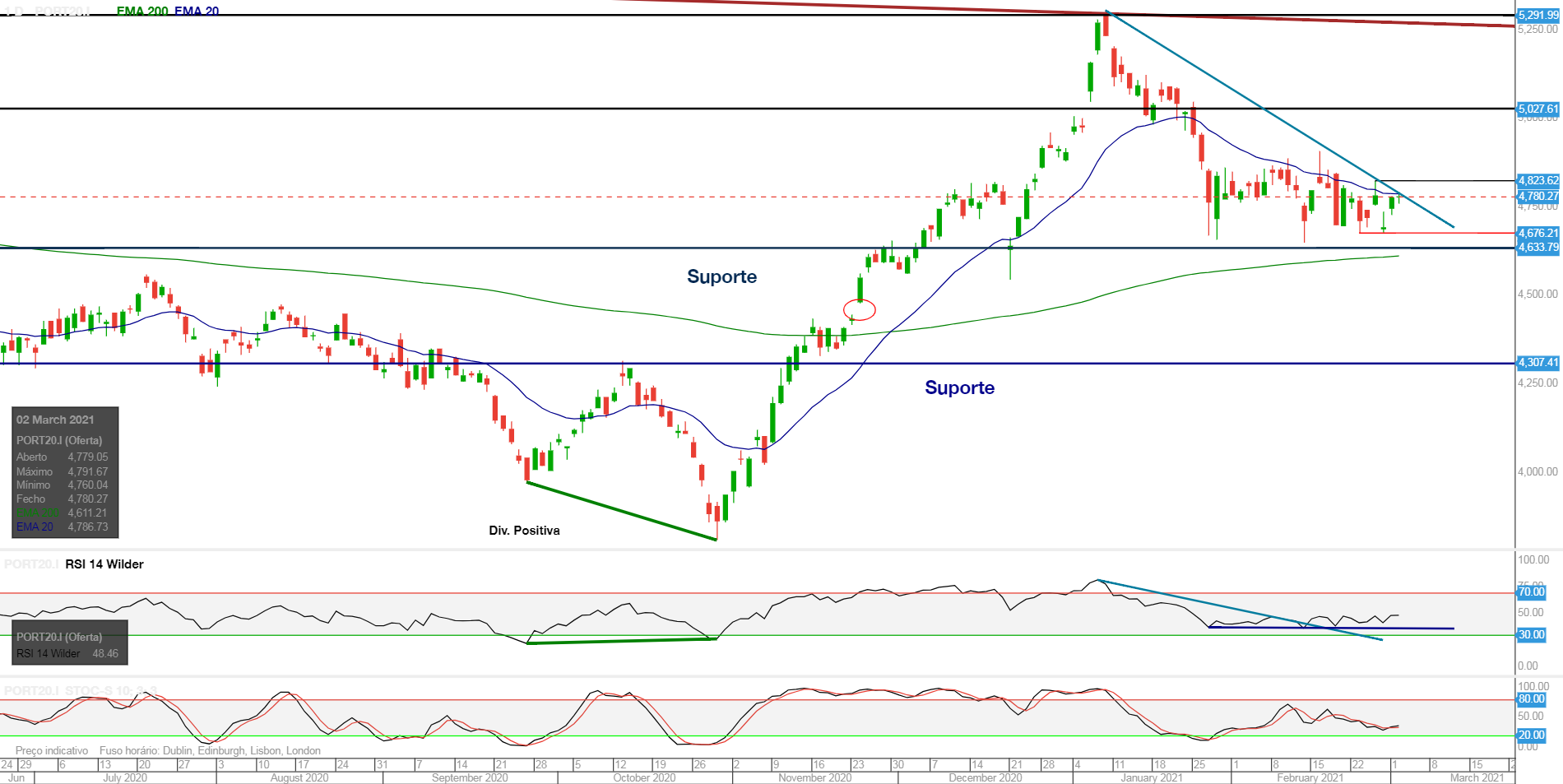 Tecnicamente tudo indica que o PSI tem espaço para continuar a crescer por algum tempo, de momento não aparenta nenhum sinal de venda, o primeiro sinal seria com a quebra dos 4690.