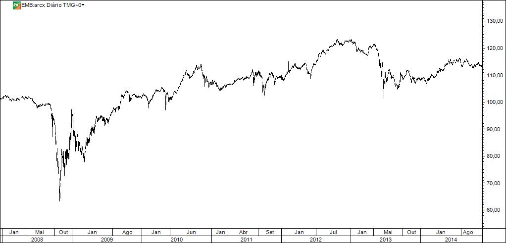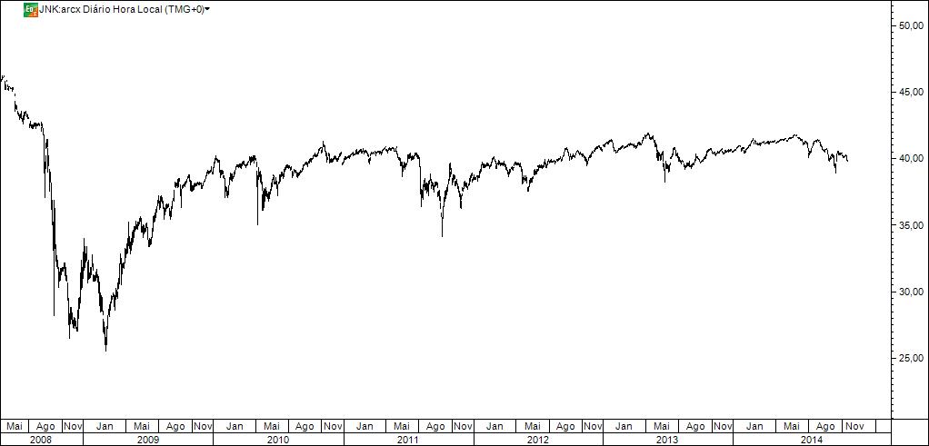 Segue um gráfico do SPDR Barclays High Yield Bond ETF (JNK) e do iShares J.P. Morgan USD Emerging Markets Bond ETF(EMB): o que eu vejo é que eles perdem gás para cima...