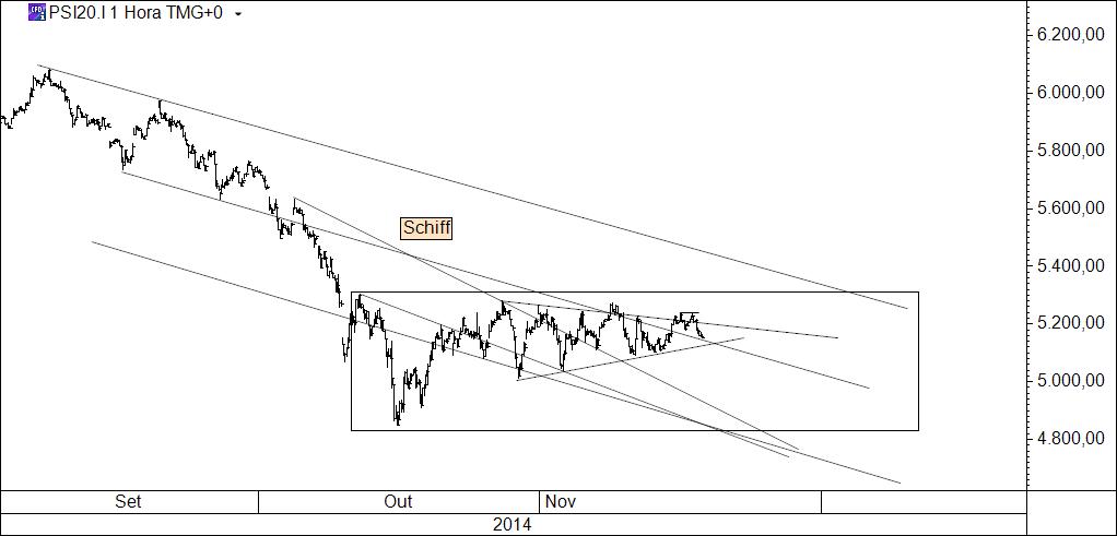 A minha visão sobre o psi20 usando um gráfico de 1 h (quanto ao gráfico diário já me pronunciei e nada há a acrescentar): enquanto a área de consolidação não for violentada de modo consistente - repito, de modo consistente, the only way is up.