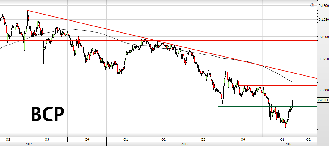 "O BCP continua com uma tendência de médio e longo prazo de queda, ainda assim inverteu no curto prazo. Pode não ser muito mas e com toda a certeza uma boa notícia para os milhares de pequenos investidores que detêm posições longas no BCP, infelizmente muitos deles a preços muito acima dos atuais. Em pouco mais de um ano, desde finais do verão de 2014, até ao início deste ano, o BCP desvalorizou mais cerca de 70%. São perdas avultadas difíceis de recuperar. Para alguém que tem BCP a 10 cêntimos este teria mais do que triplicar a sua cotação no dia em que bateu nos mínimos deste ano, em torno dos 3 cêntimos.