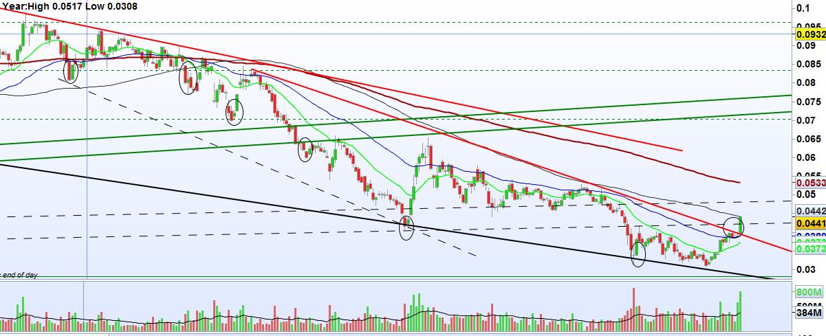 Próxima resistência estará nos 0,052... até lá tem caminho aberto....