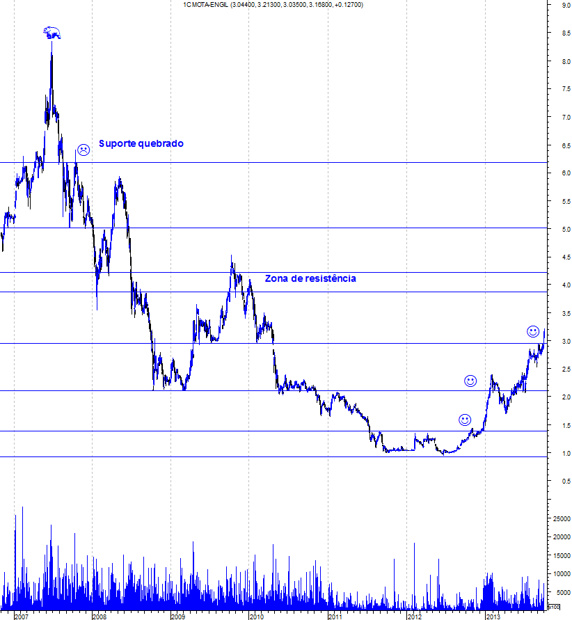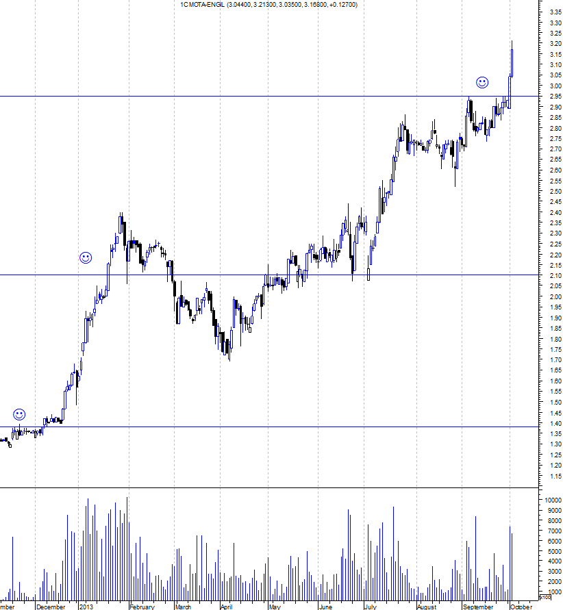 Na minha análise tinha definido os 3,50 como próxima resistência, no entanto se se confirmar o avanço das bolsas americanas de hoje durante os próximos dias, (fim do shutdown, aumento do teto da divida...), poderemos estar a assistir ao inicio de um forte movimento das bolsas que têm estado retraidas nas últimas semanas. Este movimento a acontecer nas ações que se encontram Bullish como a Mota pode eliminar por completo qualquer tipo de resistência.