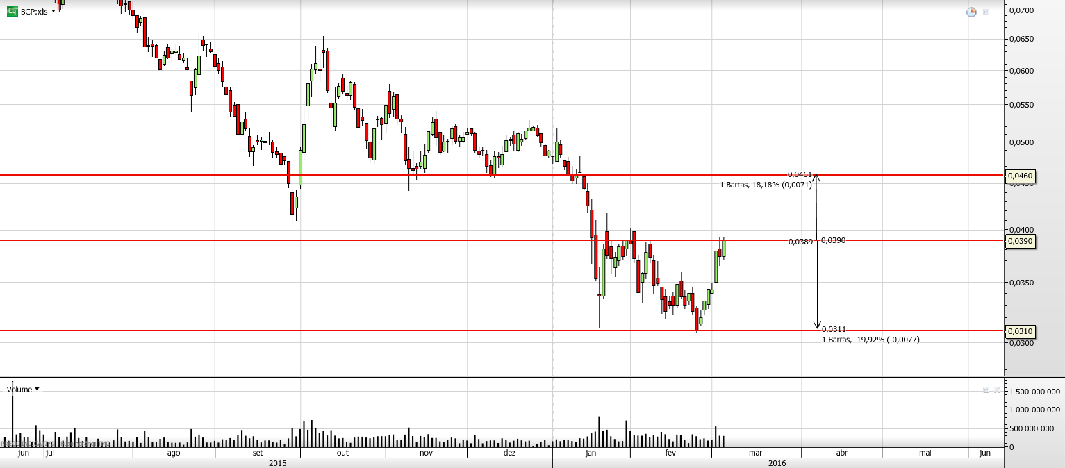 O BCP encontra-se em mínimos com máximos de posições curtas. Os BCP após a comunicação de uma possível unificação com o BPI, ficou completamente nas mão dos shorts, que levam o BCP para o preço que vem entenderam. O BCP tem caindo conforme foi aumentando o volume de Short. Alias, sempre que o BCP tentou inverter e testar resistências foi sempre travado com entradas de curtos.
