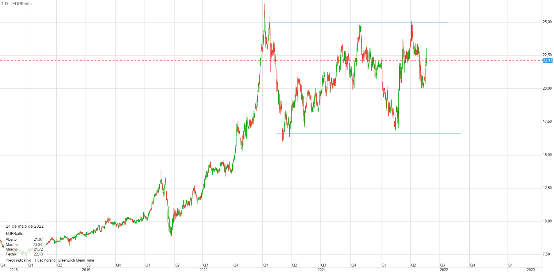 Se formos a analisar o comportamento da cotação da EDPR, nos primeiros dias do mês de abri e até se processar esta venda, é fácil perceber que a cotação oscilou à volta dos 23 euros por ação.