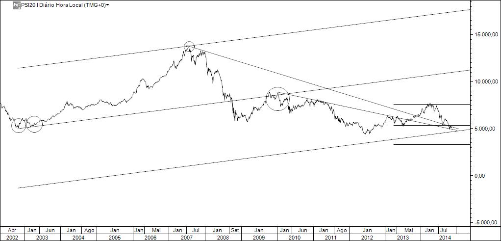 Um gráfico do sp500 desde 2002 contendo informação pertinente para decifração. Um gráfico do psi20 também de largo espectro. Em ambos está no prelo algo de dramático.