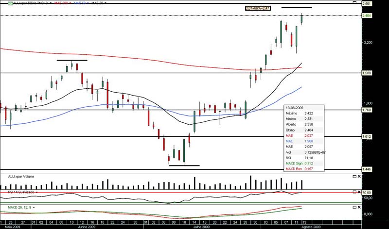 paubo Escreveu:A alcatel quando começou a recuparaçao em Março andou em estado sobrecomprado ate meio de Maio. Será normal ela em breve fazer uma correçao ou pelo menos respirar um pouco. Acredito que se nao tivermos grandes correçoes nos mercados depois destas subidas em alguns casos enormes (tantos indices como empresas) nos proximos dias ela vai dar um beijinho na proxima resistencia por volta dos 2,50 sendo este um bom ponto de venda para quem as tiver.