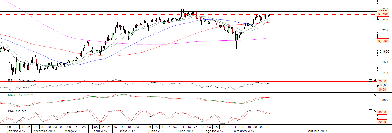 E se passar essa barreira ( que considero forte ) com razoável facilidade, antes do final do ano deverá estar nos 0,30€ tal como penso e já escrevi num post há alguns meses atrás. Caso contrário, vamos andar a moer os 0,245/0,25€ nestes 2 meses e pouco que faltam.