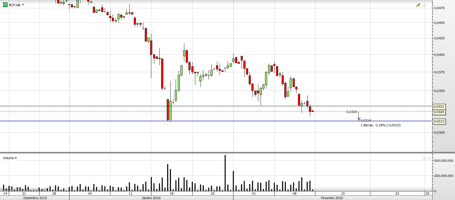 Com o Spx500 em tendência descendente e a possibilidade de continuação das quedas nos mercados, começo a pensar que se põe a hipótese com algumas retrações pelo meio, de irmos visitar os 0.027 aqui no Bcp, veremos
