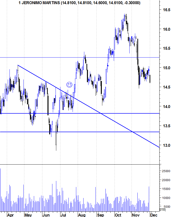 A JMT vem já desde os 15.75 com 3 velas vermelhas pronunciadas de queda e agora com mais 2 velas vermelhas nos ultimos 2 dias . Fica a sensação que se está a intensificar o movimento de queda , sem se vislumbrar forte interesse comprador.