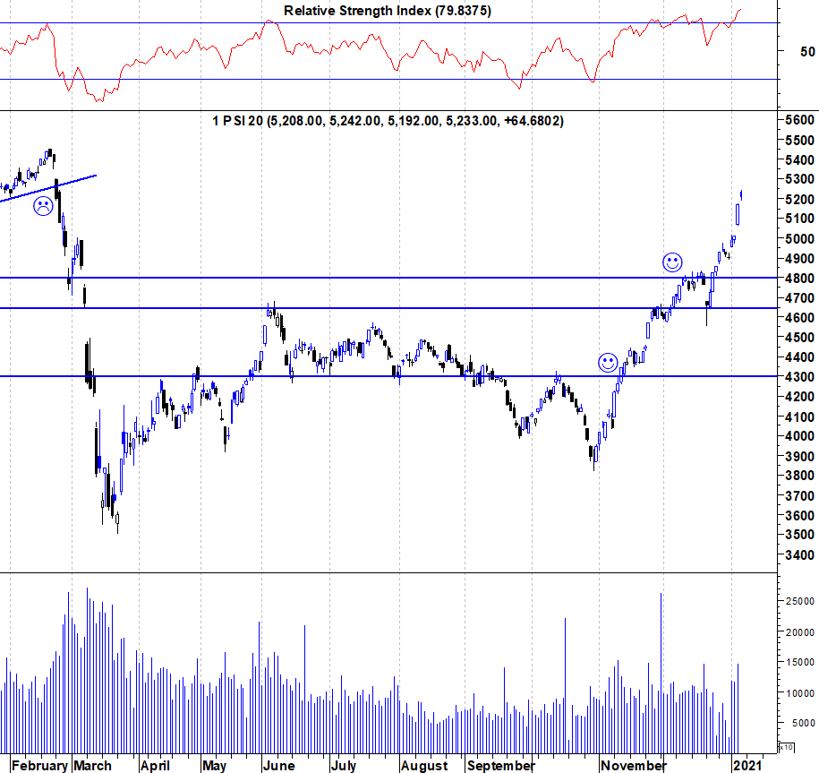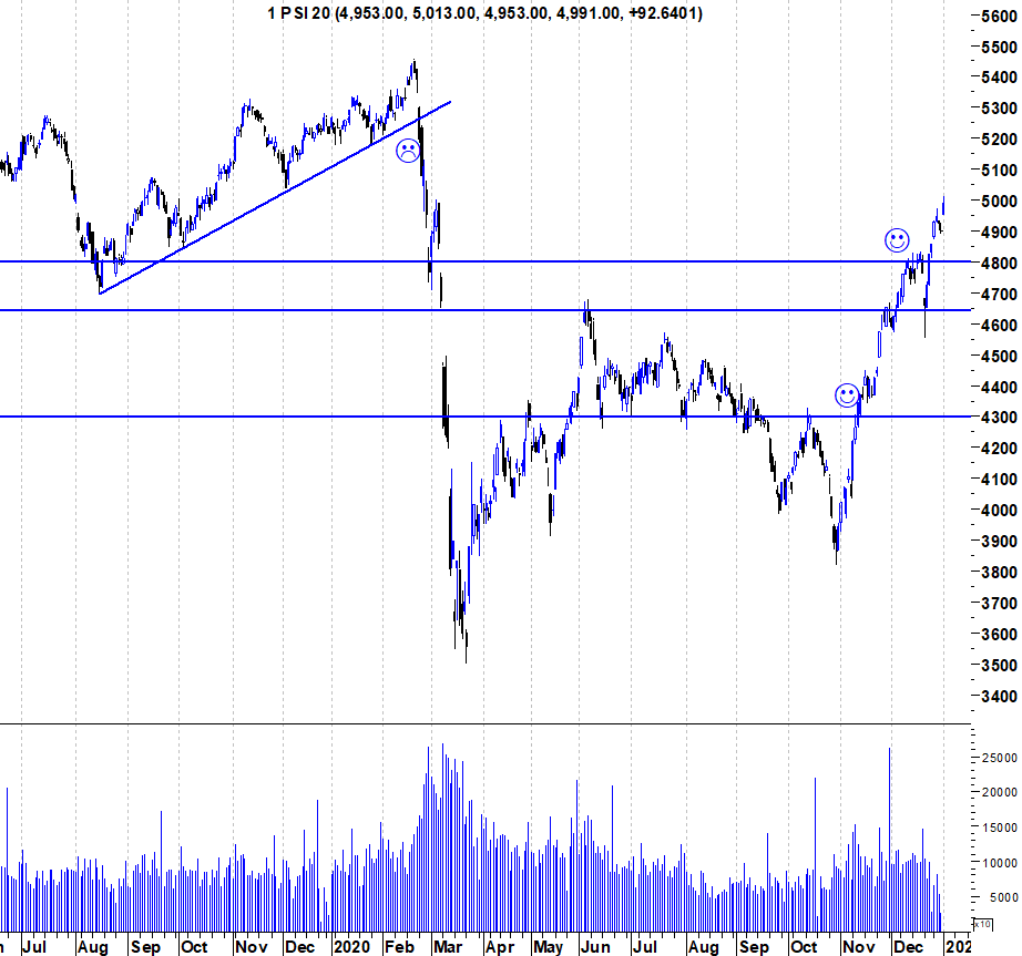 Passar os 5000 assim de um tiro não creio, mas uma aproximação desde que se soube da eficácia da vacina que acreditei, o que até nemseria difícil de prever. O raciocínio foi até ao nível da 4.ª classe: se caiu dali por causa do vírus, então volta ali por causa do não vírus. E este raciocínio simples deu-me um presente de Natal no DAX e outro no CAC. Coisa pouca que a vida não está para grandes aventuras.