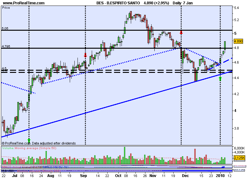Saí do BES a 4,99 pois não só tinha debaixo de olho uma acção que julgo mais atractiva do mesmo sector (BNP Paribas), mas também porque num inicio de dia bem positivo testou a resistencia que julgo estar a 5,05 e depois lentamente começou a descer.