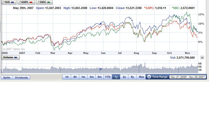 Na sessão antes do dia de Acção de Graças, os títulos das principais empresas financeiras e energéticas desvalorizaram, prejudicando os índices de referência do Wall Street, notando os observadores a existência de receio por parte dos investidores em que as perdas relacionadas com o 'subprime' se espalhem ao resto da economia.
