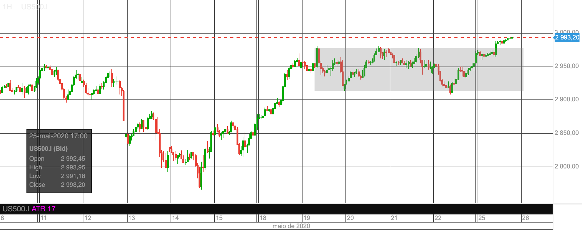 Ou já não percebo nada disto, ou claramente rompeu em alta aquele range. Bem sei que a liquidez é fraca (hoje foi feriado nos EUA), mas com tanto short entalado, isto poderá ter combustível para atingir o alvo (~3040). Vamos lá ver...
