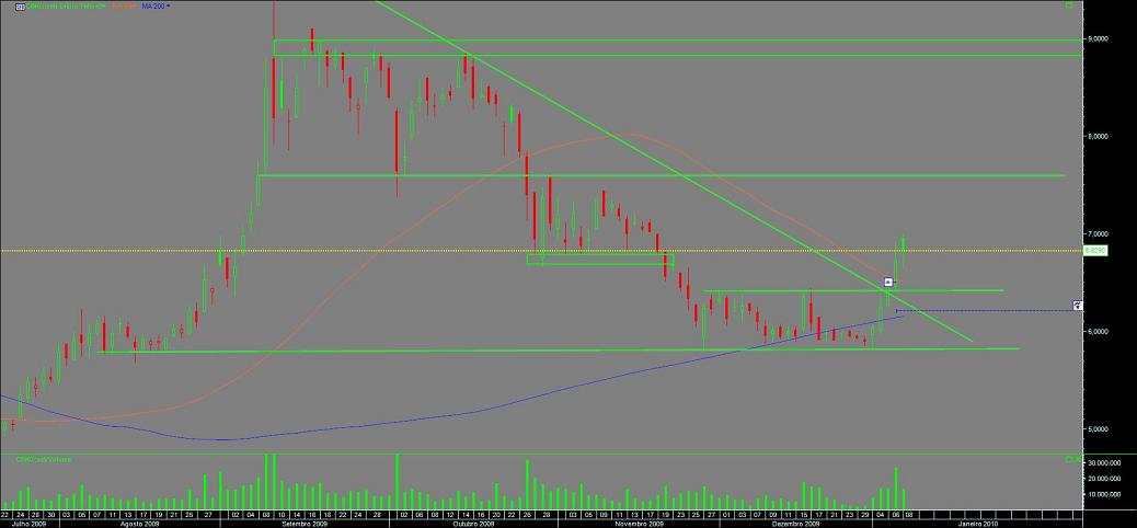 Entre o final de Novembro/2009 e início de Janeiro/2010 o Commerzbank esteve a oscilar à volta da sua zona de suporte nos € 6,00 - € 6,10 - € 6,30. Os bulls até que tentaram levantar a cotação na primeira quinzena de Janeiro, mas infelizmente esbarraram na sua Linha de Tendência Descendente (LTd) de médio prazo, o que forçou o título a retomar o seu anterior ritmo de quedas.