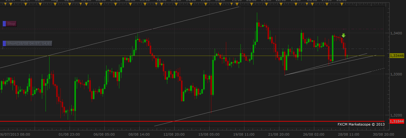 1º teste intraday do euro a LTA's. Mais abaixo, teste crucial ao limite do canal ascendente. Abaixo dos 1,3270 deixa caminho livre a próximo suporte a 1,3185.