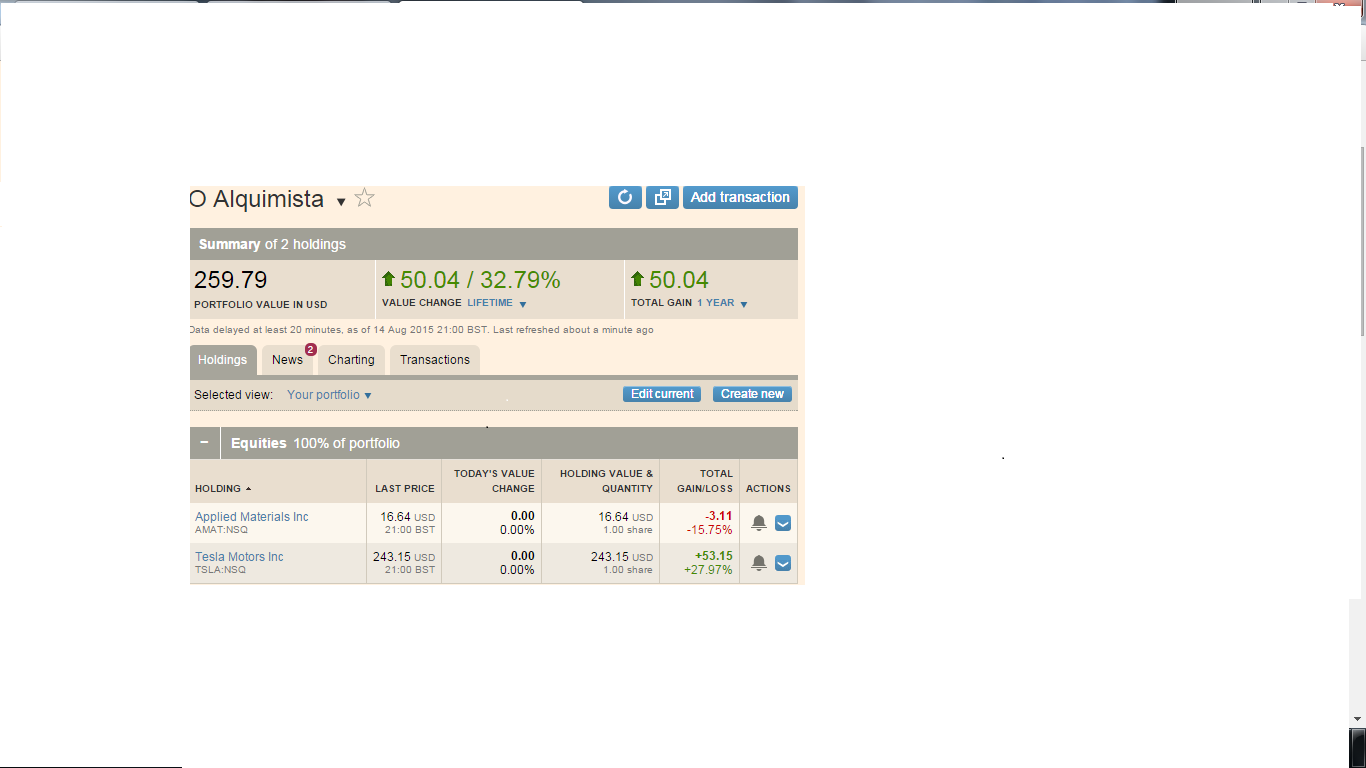 Breve referência à carteira "O Alquimista", que há já bastante tempo não era aqui mencionada, sendo constituída por dois activos (amat e tesla), oportunamente aqui referenciados como oportunidades "não encobertas" do tipo buy and hold.