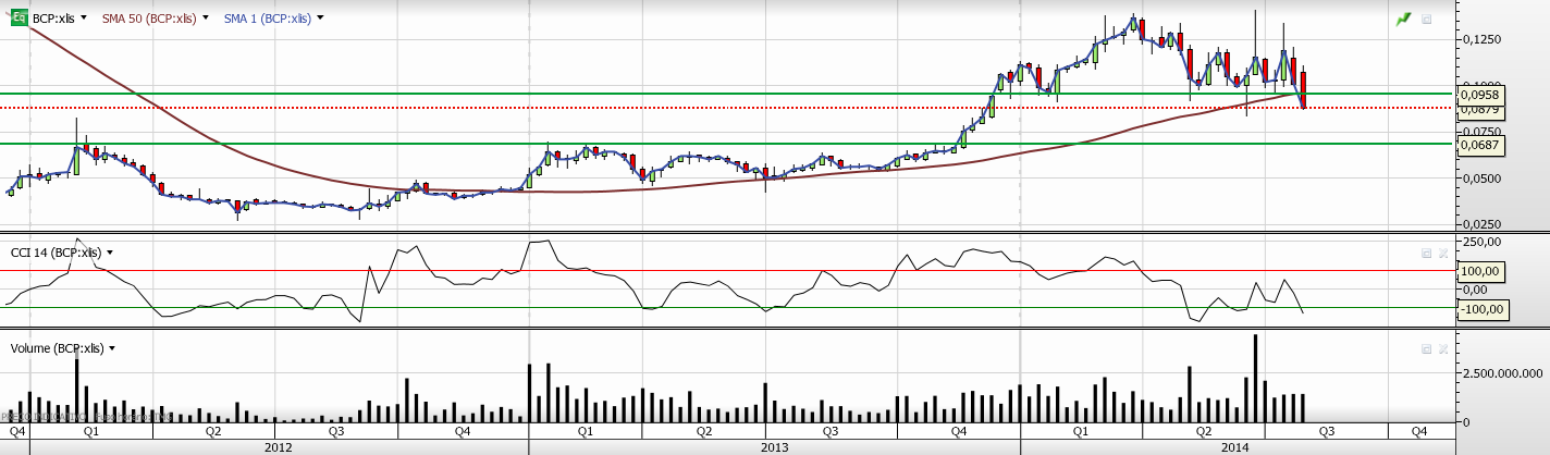 O bcp como se vê no gráfico semanal está a quebrar a SMA50, na minha opinião se na sexta feira quebrar mesmo, então tem boas probabilidades de vir aquela zona dos 0.06€, aí poderá então reagir.Neste momento no gráfico Diário, está sobrevendido e é provável que suba, pode até anular a quebra que está a fazer na SMA50 no gráfico semanal.