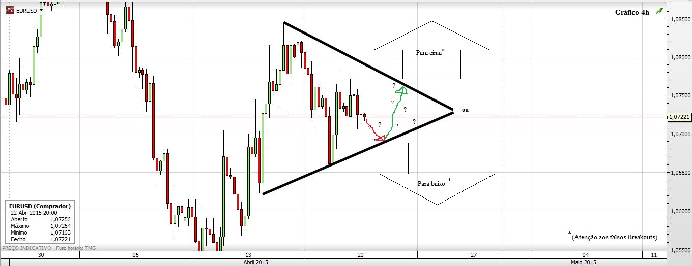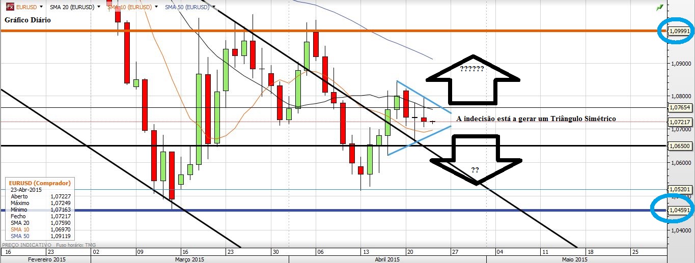 Muita indecisão no EURUSD... com tanta indecisão surgiu um Triângulo Simétrico... agora resta saber para onde é que ele vai quebrar.... O meu palpite é que vai quebrar para baixo, mas antes faz um falso breakout para cima só para enganar a malta... A pasmaceira deverá estar próxima do fim...