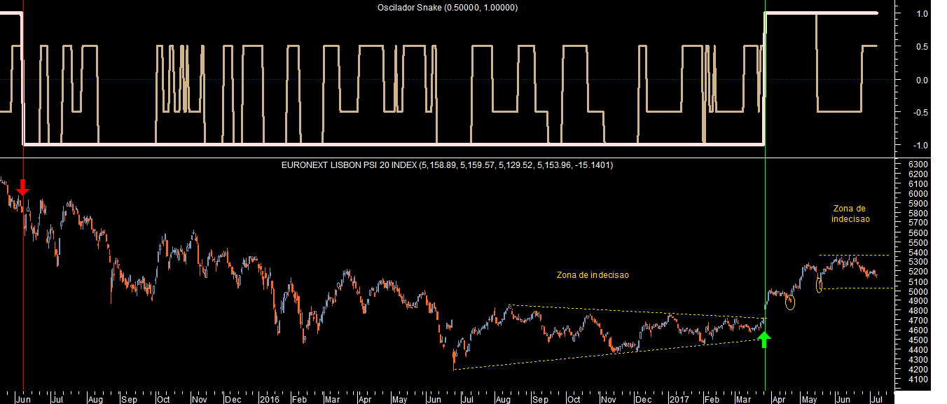 Em resumo: estamos provavelmente a viver uma fase de um mercado “sideways” mas com um risco bastante próximo de retomar o anterior "bear market" se descermos abaixo dos 5000 pontos, ou seja, apenas a cerca de uma baixa do PSI na ordem dos 3%; por outro lado o "bull market" seguro ainda se encontra numa zona bastante distante, na ordem da necessidade do índice ter de subir ainda uns bons 36%!