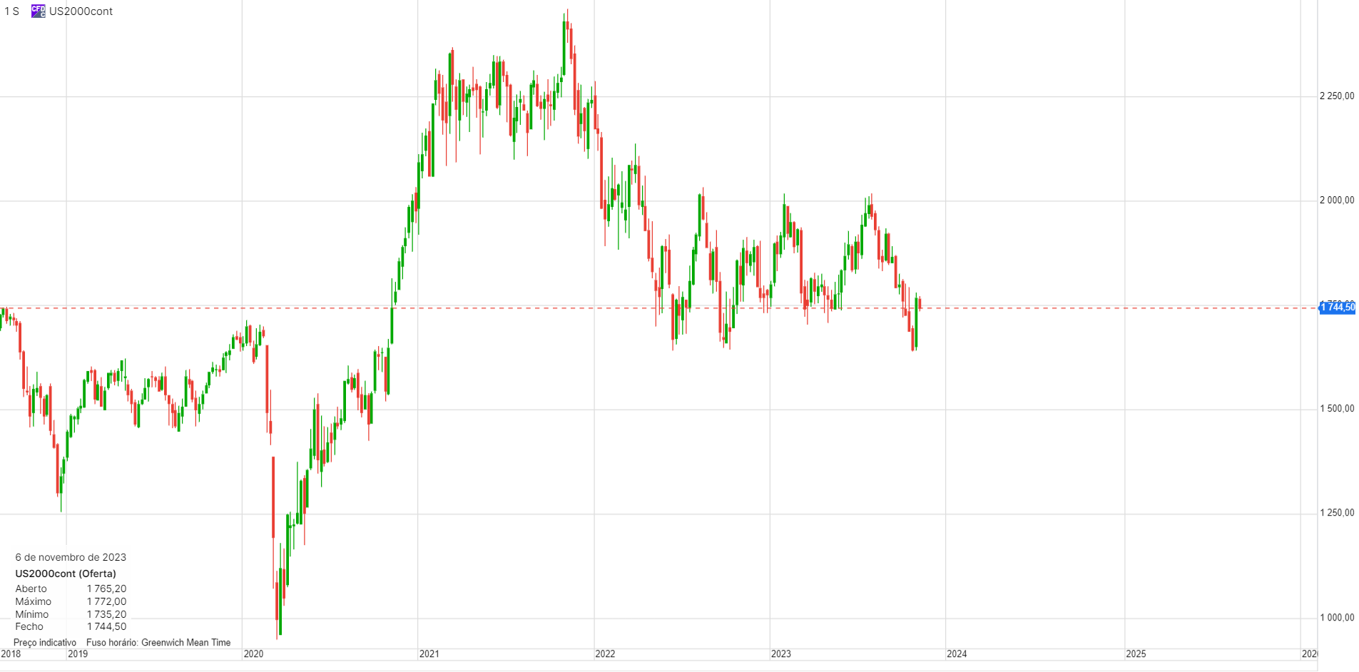 Eu não negoceio o Russel 2000, (não há CFD) mas não vejo no gráfico nada de mais, está exatamente onde estava em Janeiro de 2023. Ou em Maio de 2022. Ou eu estou a ver mal a coisa (o que acontece por vezes, diga-se) ou estás demasiado pessimista.