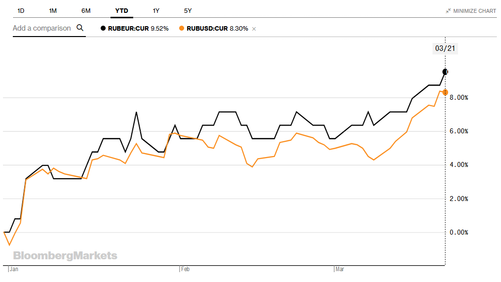 Já reparaste que o RUB está a bombar este ano vs. EUR e USD? +9.52% e +8.30% respectivamente.