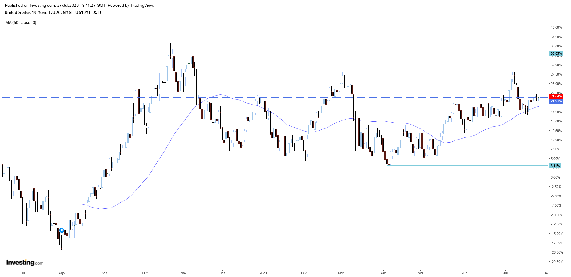 Além de que os juros nos EUA voltaram a disparar. Afinal, os dados macro ainda estão com força suficiente... talvez não tenha sido ontem o fim das altas de juros do outro lado do Atlântico.