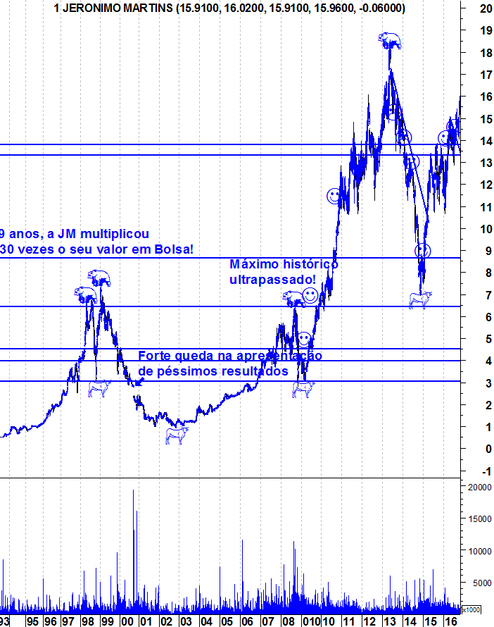 Clinico Escreveu:Euro, vamos lá devagarinho: porque é que vai cair?? A JMT está a viver um fabuloso bull market, com bons resultados com projectos futuros, porque vai cair?? Se me disser que vao haver correcçoes técnicas quando está sobrecomprado e que podem dar boas oportunidades de compra, eu aceito. Nada sobe ou desce para sempre.