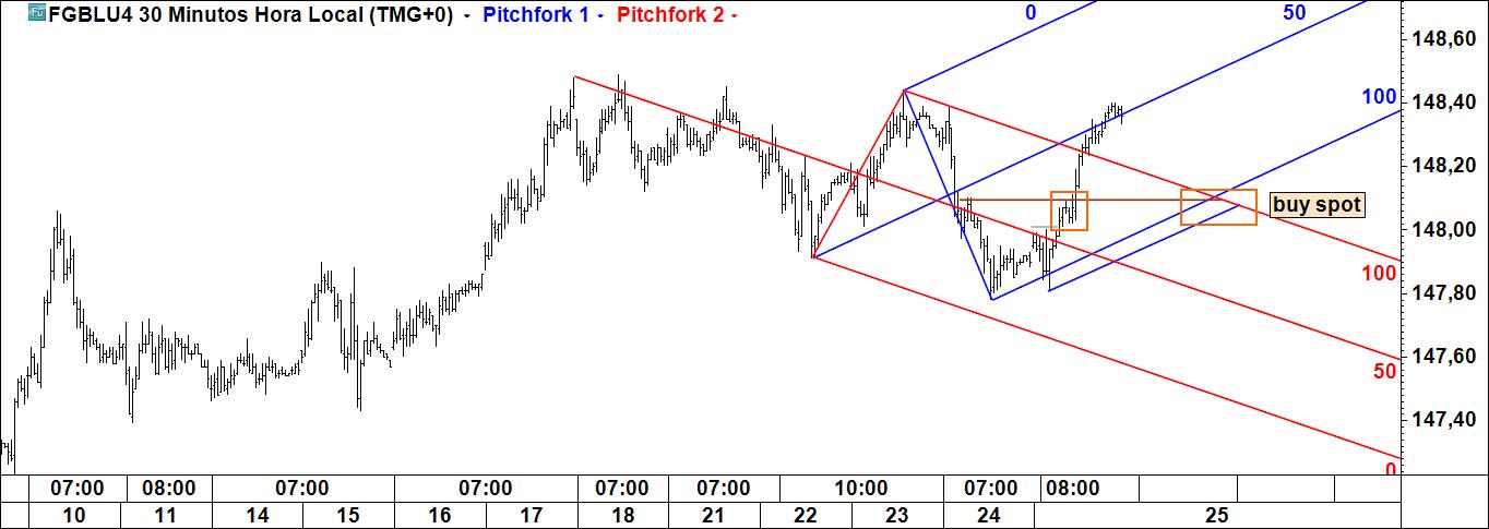 Primeira oportunidade: no Verão há quem procure colocar o dinheiro "ao fresco" (comprando por ex. bunds). Para esse efeito, eis uma oportunidade no fgblu 30 m, com identificação do buy spot, colocando-se a stoploss abaixo do pivot b do fork ascendente e target (pelo menos) na sua linha média superior. O porquê do negócio: encontrando-se o preço em consolidação no decurso de uma fase ascendente procura-se encontrar um movimento correctivo que nos dê um bom ponto de entrada em face do ratio r:r 1/3. Esse ponto de entrada é-nos dado pela confluência das linhas que uso.