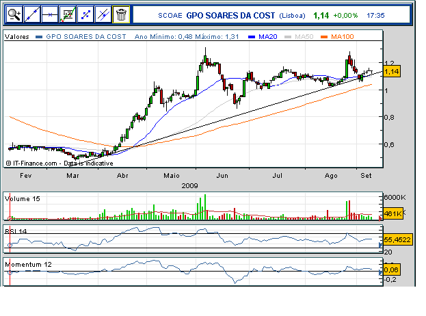 Após as correcções dos ultimos dias onde os investidores aproveitaram para efectuarem mais valias, a SC encontra-se agora a consolidar nesta zona de suporte entre os 1.11 e os 1.18, penso que após alguma consolidação dentro destes valores e um fecho acima dos 1.18, não demorará muito a testar de novo os 1.30 (valor que já testou recentemente por duas vezes), e como à terceira é de vez, se romper os 1.30 ficará com caminho aberto para testar a nova resistencia nos 1.40 servindo então os 1.30 como suporte.