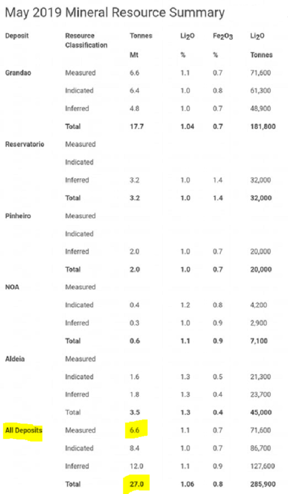 Não são 27 milhões de toneladas de lítio mas de espodumena (a cerca de 1% de concentração de lítio, ou melhor, Li2O, óxido de lítio).