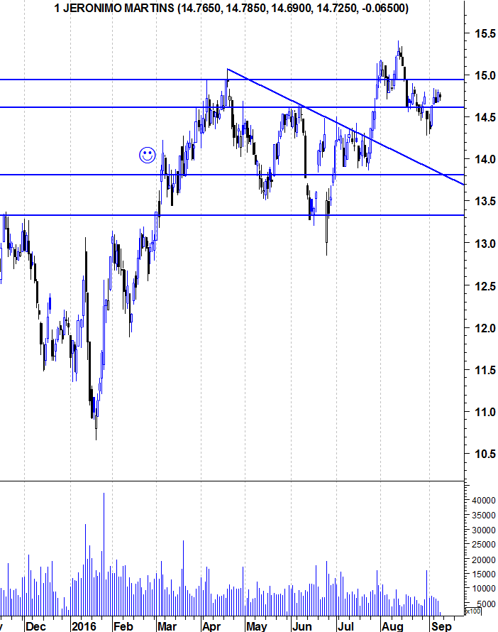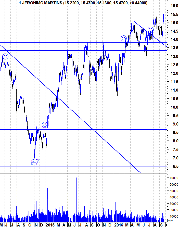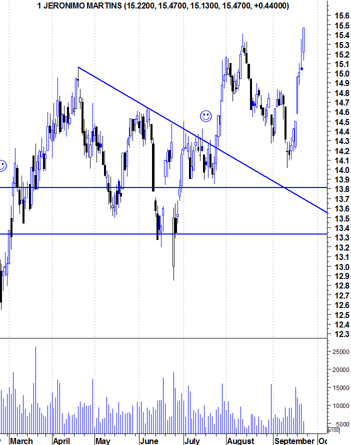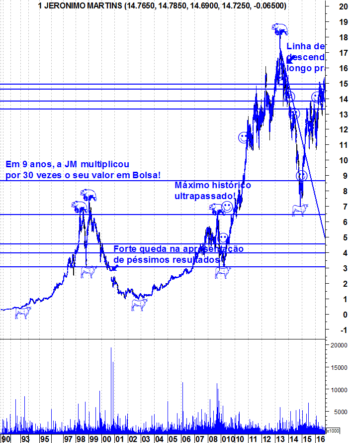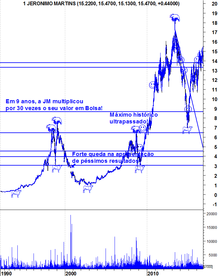Em termos de médio e longo prazo, continuo com o meu fato de touro vestido pois a Jerónimo Martins ainda não deu qualquer sinal de fraqueza e há que ir respeitando a força da tendência. Para quem está de fora e quer entrar na acção deve esperar por uma retracção ou pela quebra da resistência na zona dos 15 euros, pois seriam mais sinais de força e abririam portas para que a acção tivesse muito espaço para subir.