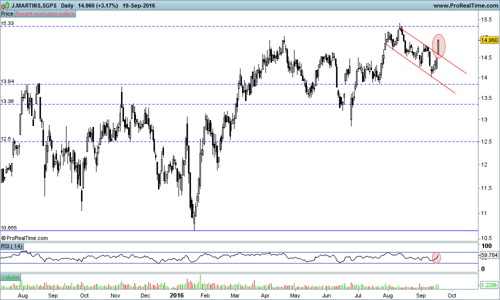Surpreendente foi a recuperação da Jerónimo Martins. O gráfico diário parece uma montanha russa e, depois de ter estado a descer cerca de 1,5%, acabou por recuperar e já está positiva. Pena estar de fora desta.