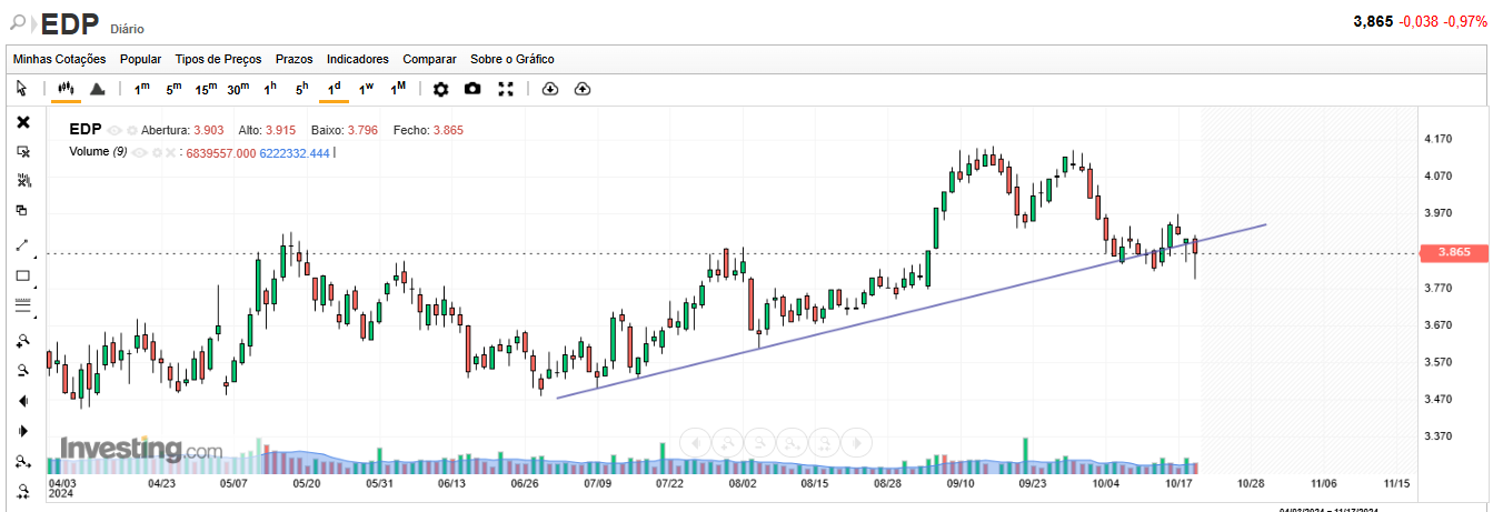 Em 01/05/2024 o gráfico mensal da EDP já tinha mostrado que a tendência seria de queda. Isso ainda não era visível, então, no gráfico diário da EDP (o gráfico mensal funciona de certo modo como um indicador avançado).