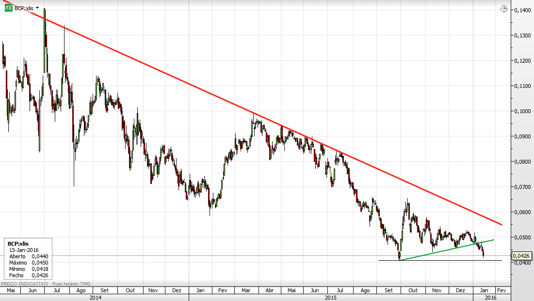 E cá estamos nós colegas na casa dos 0,04cts e que penso que em breve fure mais abaixo,afinal nao foi preciso vir nenhuma guerra para meter o bcp nestes valores,como se dizia por aqui.Graficos nao funcionam,nao utlizem,isso é coisa de malucos,deixem que eu utilizo