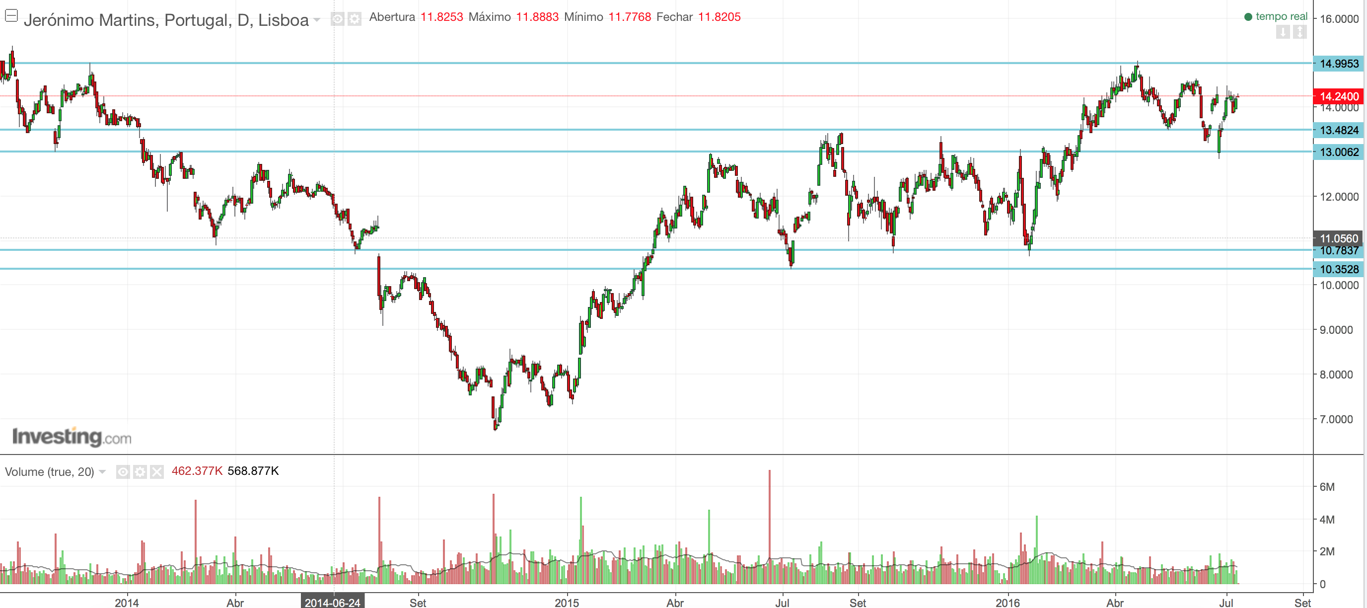 Na bolsa portuguesa são poucas as acções que estão em tendência ascendente, ou Bull Market, sendo a Jerónimo Martins uma delas. Como se verifica no gráfico abaixo, em Novembro de 2014, quando a Jerónimo Martins ressaltou do mínimo relativo um pouco abaixo dos 7€, iniciou o seu Bull Market que se mantém ao dia de hoje.