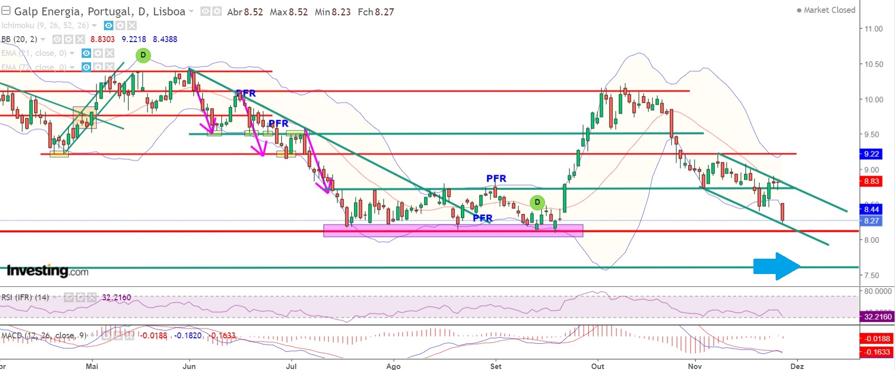 A Galp acabou por quebrar em baixa a zona de suporte pelos 8,70 e continua sem sinais de força.