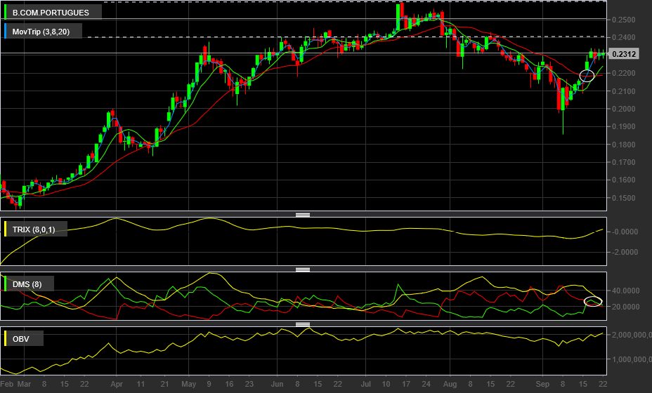 Na minha opinião o BCP poderá andar entre o valor do gap e os 0.24cts nos próximos dias. Se o OBV romper a zona de resistência entretanto, podemos ter mais sinais sobre a superação dos 0.24cts.