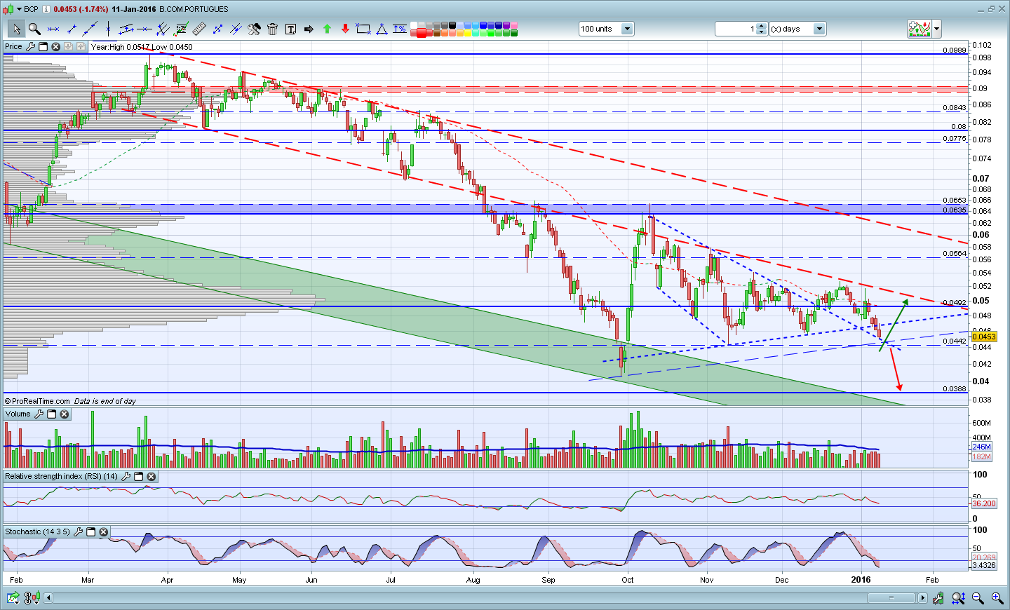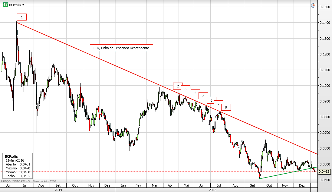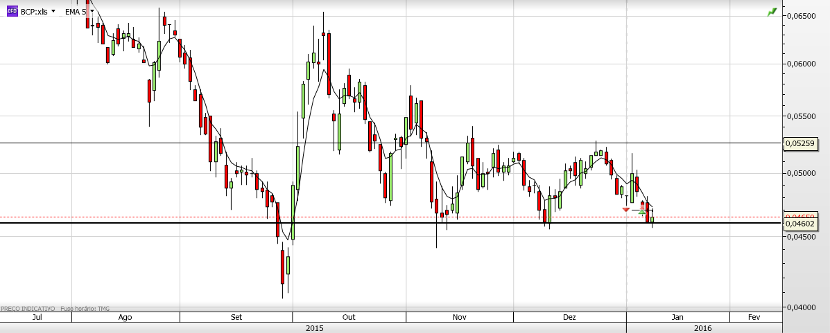 Este titulo tem uma componente psicológica marcada... talvez fosse interessante também fazer uma análise psicológica (AP) ao comportamento do titulo... já se percebeu que o titulo tem desvios comportamentais, ou seja, não faz o que devia fazer que era subir :-) ... reparem que as resoluções do BES em duas fases e o banif numa só fase acarreta um sentimento negativo a qualquer investidor nacional ou internacional... já repararam na desconfiança que paira sobre o setor financeiro derivado da incerteza que o BCE e banco de Portugal colocam na gestão dos últimos processos, o banif que parecia o negócio do ano tornou-se no pior do ano, o bes que tem nova resolução... o bcp cota a valores que parecem super interessantes. Mas será que vale correr o risco? por isso este titulo tem uma carga psicológica muito elevada, acompanhada de uma incerteza que potencia ainda mais o sentimento negativo.... não se sabe quando vão ser pagos os cocos, não se sabe o que vai acontecer com os ativos por impostos diferidos, para além de outras duvidas ou invenções de ultima hora...