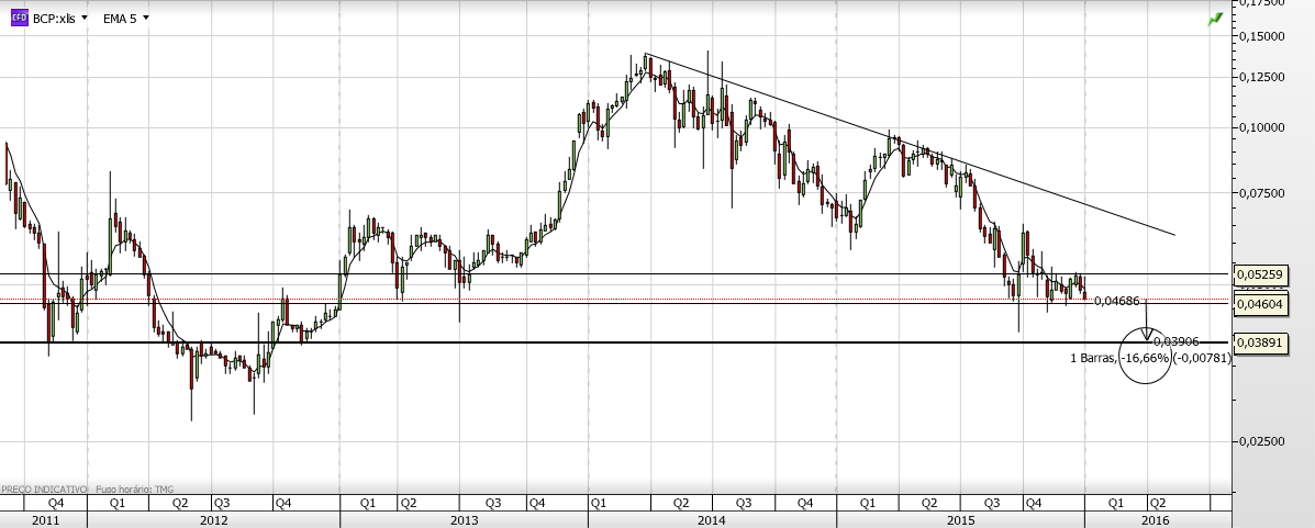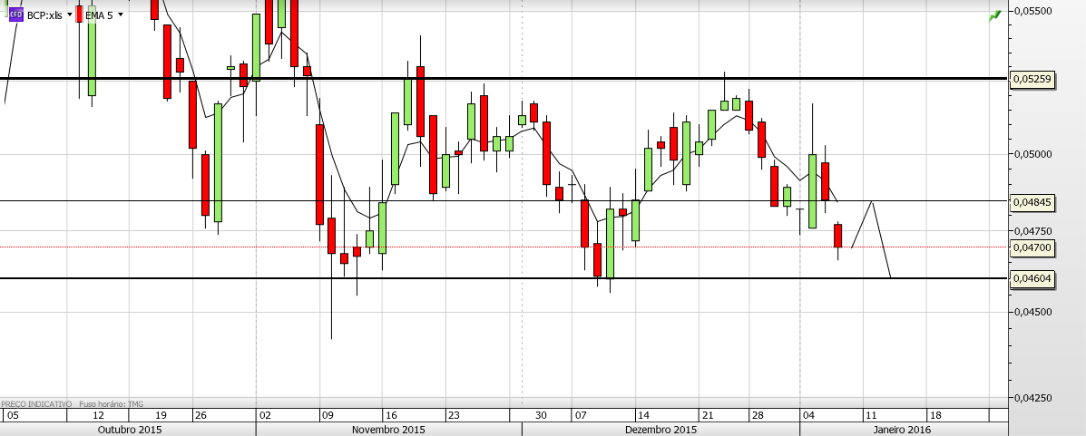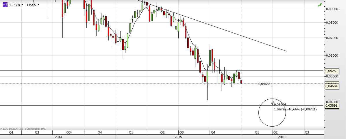 Aproveito para dizer que, na sequência da mensagem do artista, sinceramente acredito no Bcp, acredito que vai superar as dificuldades e espero vê-lo em tendência ascendente; agora no curto prazo, não estou muito optimista, o mais importante é seguir não o que queremos que aconteça mas o que o preço faz nos suportes e resistências , como a tendência é descendente nos gráficos só faz sentido negociar a favor dela