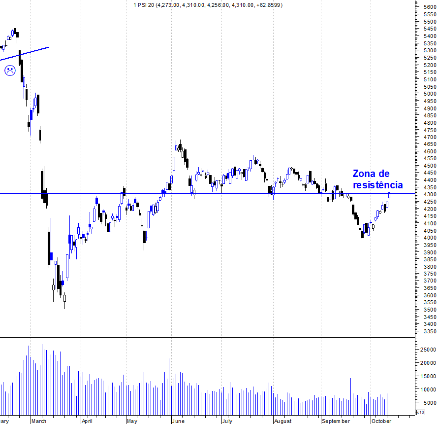 Aqui fica o gráfico actualizado depois do PSI ter corrigido em cima da resistência que, cada vez mais, continua a provar a sua força e a ser um marco importante caso um dia o mercado inverta.