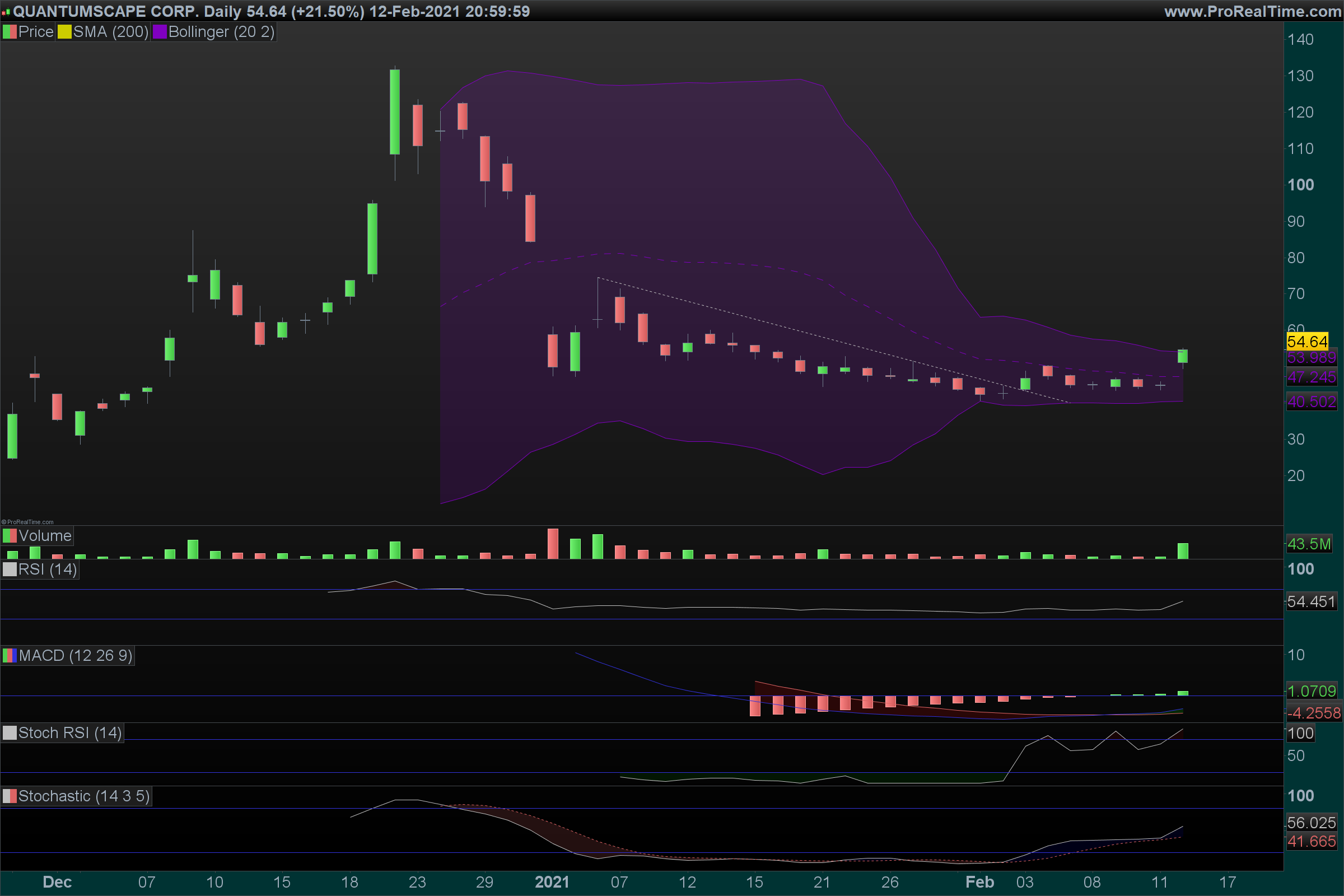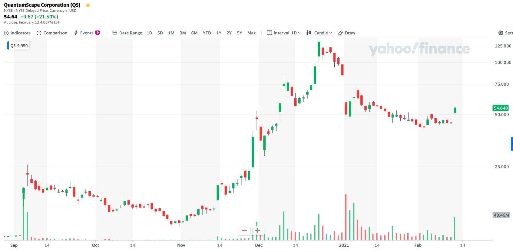 O CEO de QuantumScape, Jagdeep Singh, fez no dia 08/12/2020 um presse release sobre o estado atual das coisas. Essa comunicação ao mercado de teor muito otimista fez mexer a cotação da QuantumScape (NYSE: QS). Tendo esta saltado de $44,00 (dia 7) para mais de $76,00 (dia 10).