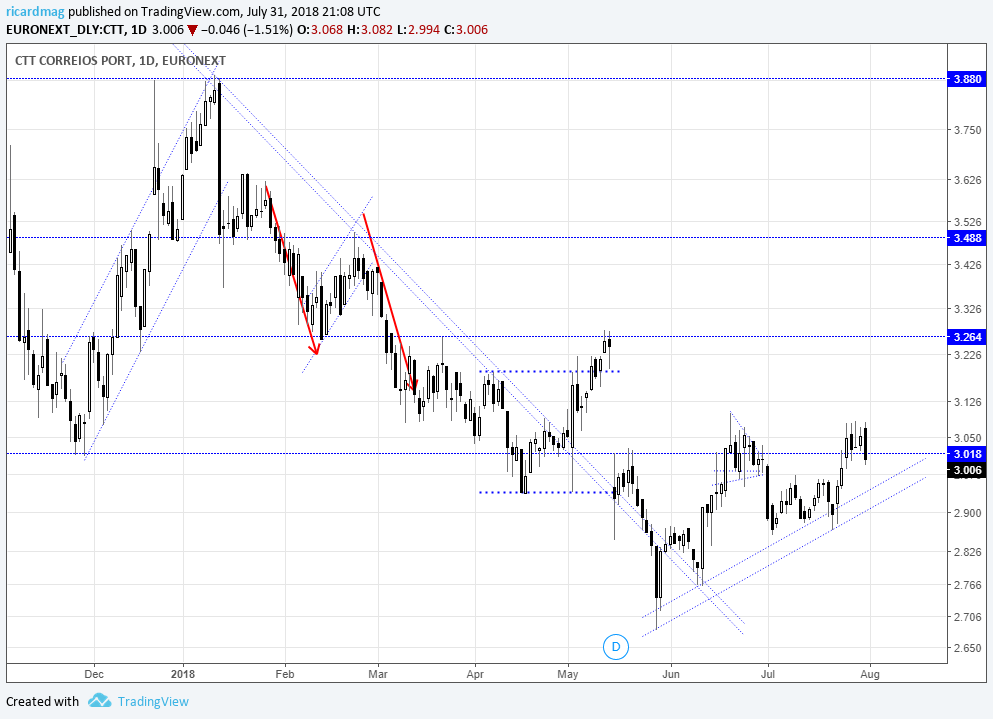 E, se houver um rompimento da zona de suporte € 2,80; € 2,60..., ou quebra da resistência dos € 3,08, e seguinte € 3,20 - € 3,30... ai a cotação poderá ambicionar outros pontos.