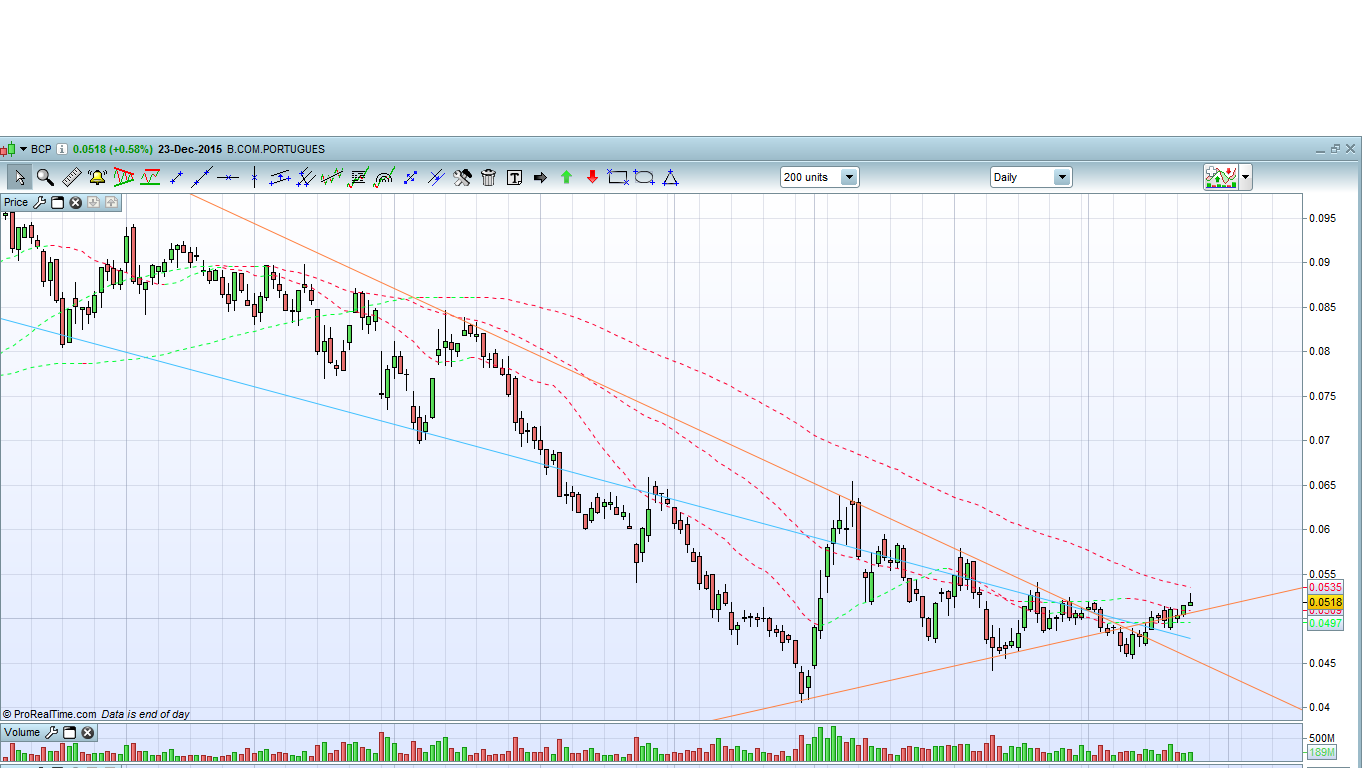 Não acho que o Bcp seja igual ao Banif, só referi o Banif para salientar que investir longo em ações que estão em tendência descendente há muito tempo é uma loucura, pois se o preço está em tendencia descendente volto a referir há muito tempo e continua, é porque as coisas não estão bem. Não nos devemos iludir com ressaltos, para investir longo com alguma segurança é preciso que quebre em alta a Ltd de forma consistente e começar a fazer topos e fundos mais altos, o que ainda não aconteceu.