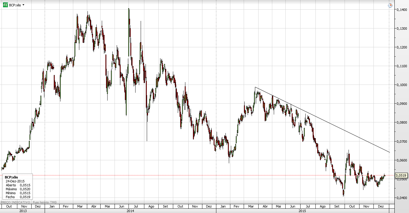 Olá manchini, depois do que se passou com o Banif não deu para aprender nada, o BCP ainda está em tendência descendente, em tendência descendente devemos estar focados em pontos de abertura para curtos e não em tentar adivinhar fundos e inversões de tendência; quando o BCP entrar em tendência ascendente, terei todo o gosto em investir longo nele, o objectivo se a analise se concretizar é o fundo do canal.